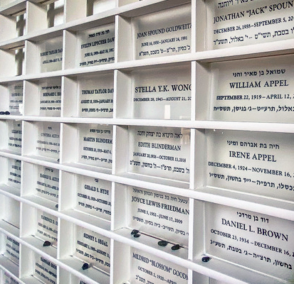 A nameplate may memorialize a parent, child, spouse or sibling, including those who were non-Jewish. Only current Beth El members may purchase nameplates, although a nameplate for a deceased Beth El member may be purchased by anyone. Nameplates are all the same size and include the English name, Jewish name if any (Hebrew or Yiddish), and the person’s birth and death dates.